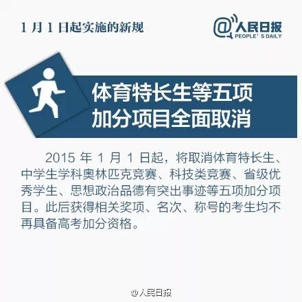 12月17日,教育部等5部门联合下发《关于进一步减少和规范高考加分项目和分值的意见》(简称“意见”),规定自2015年1月1日起,取消重大体育比赛获奖者、二级运动员统测合格者、省级优秀学生、思想政治品德突出事迹者、奥赛获奖者、科技类竞赛获奖者等全国性加分项目。