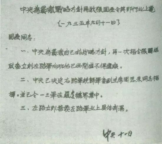 毛泽东接到张国焘要右路军南下的电报,万分焦虑。他和张闻天以中央名义连续致电张国焘,要他执行中央的决议继续北上。九月九日,叶剑英参谋长突然拿来一封张国焘给陈昌浩政委的密电。据毛泽东在一九三七年三月三十日延安中央政治局会议上批判张国焘的发言中说,电报上有“南下,彻夜开展党内斗争”的话。多年来人们一直在寻找这份事关重大的“密电”原件,但是没有找到(《叶剑英传》,188页)。